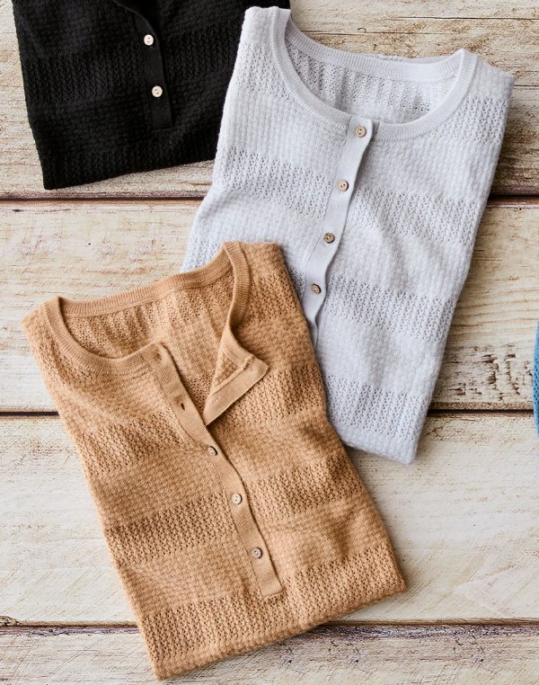 This rock steady layering piece goes with everything without missing a beat. Recycled Tahoe Fabric, allover pointelle stitch and coconut shell buttons bring little details that drop the mic.